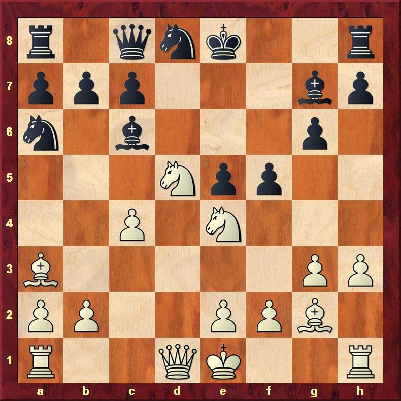 O-O a6 9. Bf4 O-O 10. Qc2 Nh5 11. Be3 g6 12. Rad1 b5 13. e5 Bb7 14. Be4 Qc8 15.